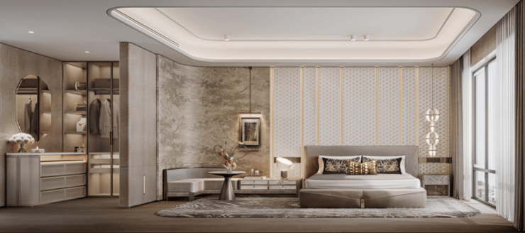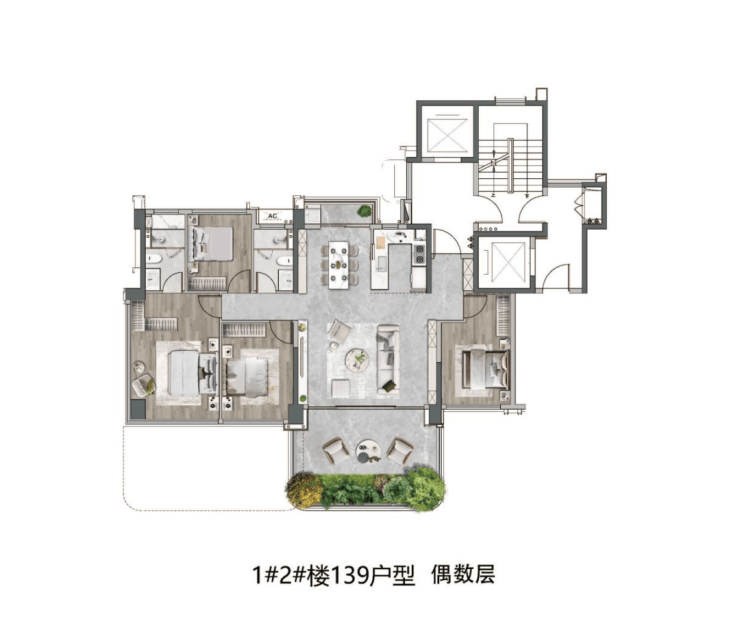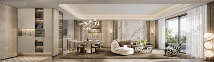 洋房户型硬装设计以侨乡风情、温馨现代为特色,融合多元文化采用明亮柔和色调,营造居住者内心深邃洋房记忆。赠送岩板电视背景墙及皮革玄关柜柜体;叠拼户型硬装设计以海派东方与滨海南洋风为设计主题,地面900×1800密缝大板砖设计;赠送石材客厅背景墙、石材岛台、岩板厨柜台面木饰面及全屋壁布。