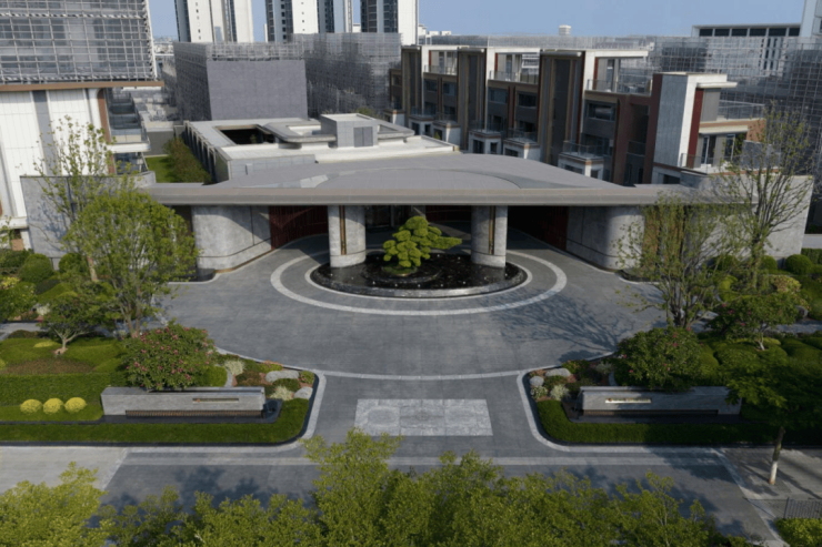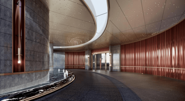 63M超宽界面,7米高的超大社区门庭,彰显尊贵气派。会所的第一界面采用地上地下联动的方式,首层为人行主出入口和艺术光厅,地下层为会所。车库出入口结合门楼整体设计打造,很好地融合门脸并体现出品质感的昭示性;同时地面利用马蹄石打造标识性及斑马线,指导人车分流。中央车站的设计,方便外来宾客临时停车,避免地面大规模建设停车场,优化空间利用,无缝衔接地库,大雨天台风天可实现无风雨归家。