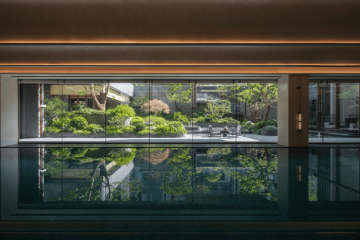 四季恒温泳池,化身为一方“海棠碧波”。我们以巨幅玻璃为界,将山水中庭尽数邀入池中。山水中庭以故乡山水为灵感,将“山、海、天”的壮阔画卷纳入日常,以镜面水景映照天光,背景借景出砖入石的精奢景墙,重现“厝中有天地”的东方意境。