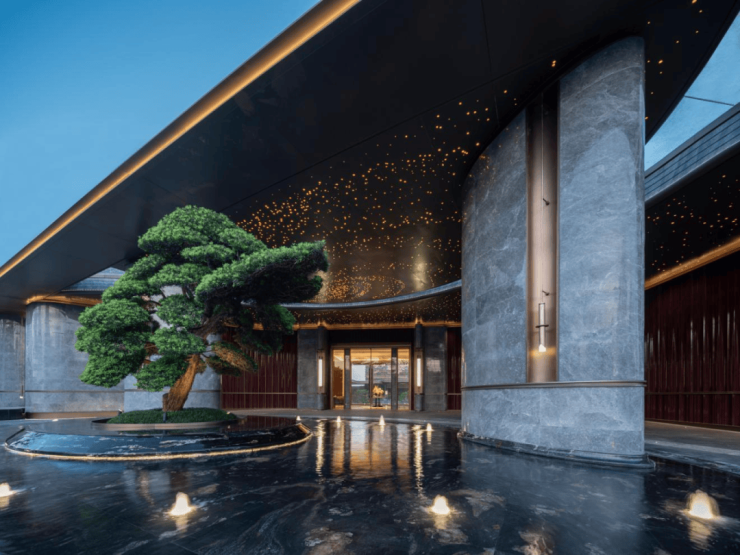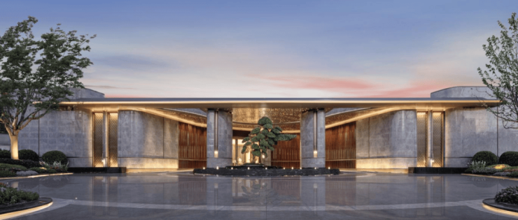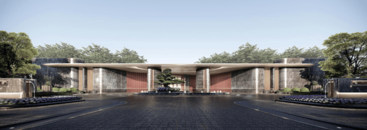 前场以“百年古樟,归港泊舟”为设计概念,百年古樟林荫如盖,树影如航道指引,从向外敞开的归航港湾,到渐近归家的私密情境,表达国贸对“出门即可上船,到岸即是到家”的海商精神致敬。约68M超尺度门庭形象展示界面形成具有仪式感、大气开阔而庄重的归家迎宾空间。