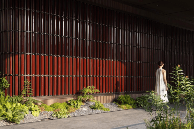 立面采用燕尾山花寓意塑造天际线,让整体建筑形态舒展,大玻璃窗与鎏金线条一气呵成,从土地抽芽向天攀生,让建筑与闽南红土共呼吸,在燕尾脊与天空的对话中,重写厝宅向上生长的当代闽南艺术。立面材料精心选用闽南红釉面陶板及砖红铝板,配合香槟金线条,爱马仕灰石材,多种色调的材质和谐搭配,展现精致大气的立面形象。波浪状陶板在晴朗的午后形成“光斑流动”的动态光影,呼应传统厝内天井日晷般的时间感知,完成“厚重传统”到“轻盈现代”的形态转译。