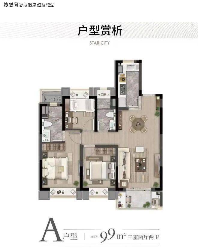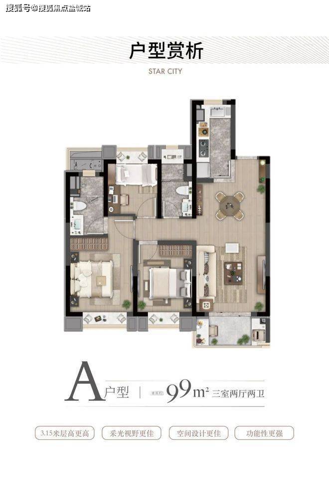 · 约99㎡户型:格局上实现南北通透+三开间朝南,采光通风效果上佳。主卧套房设计,自带卫生间,舒适度颇高!适配对品质有要求或者首改客户!