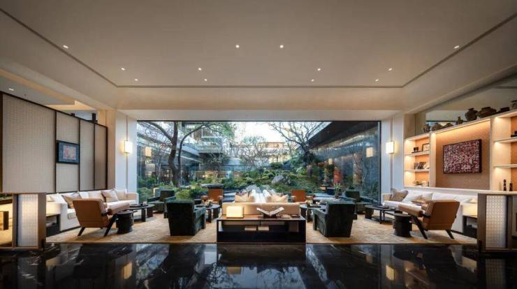 步入其中,眼前是一幅由整幅大玻璃窗映照的自然画卷,外侧曲水流觞,自然之美尽收眼底,而室内则透露着隐奢生活的气息,这种对比营造出一种强烈的视觉冲击和美感。