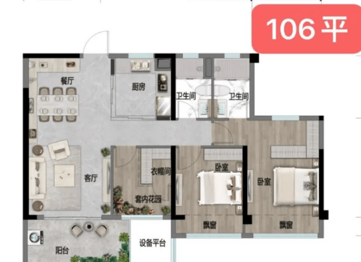 主力户型96-173㎡,得房率高,三开间朝南,部分户型带270°环幕视野、地暖及新风系统。
