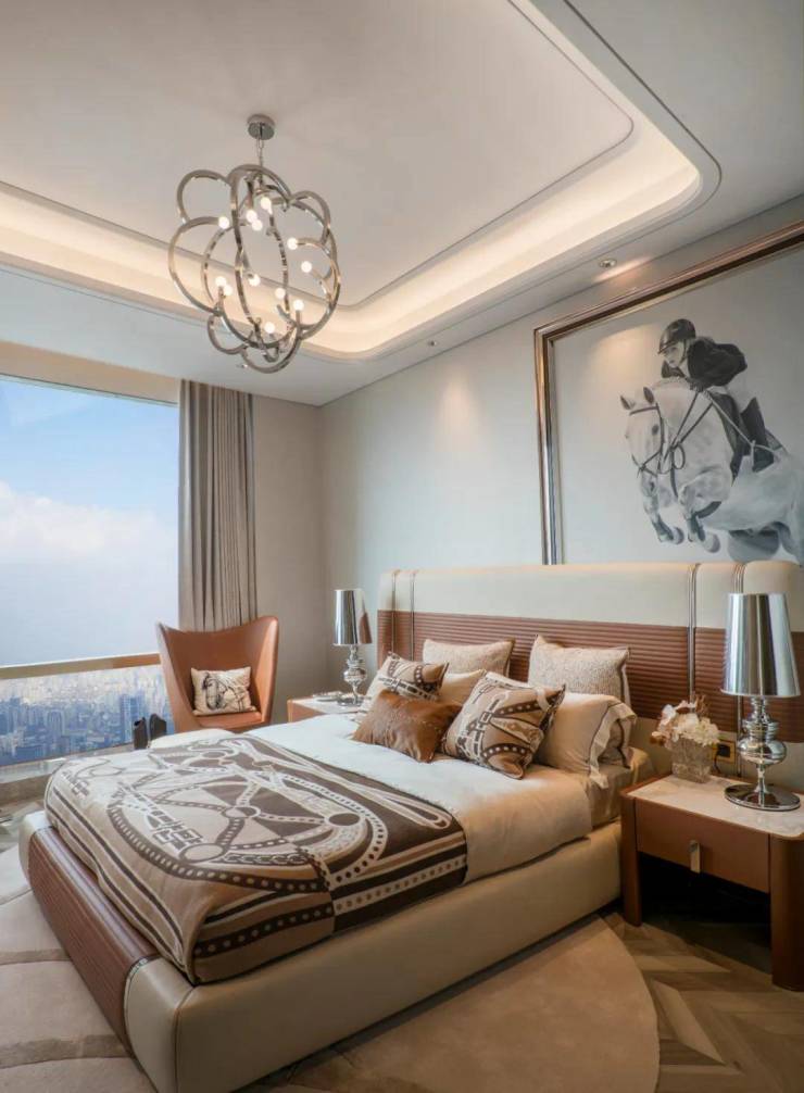 非线性的曲线造型透光玉石墙面,流线型的主卫台盆,奢华波浪,倩影流转,仿佛窗帘轻拂,玉影如流水倾泻,玉润光华,映照岁月轻叹。现今社会安全密室已经成为成功人士居家生活的一部分。主卧室的意大利Agresti安全密室,是用户的私人艺术中心,房子的心脏,更是最安全的堡垒。