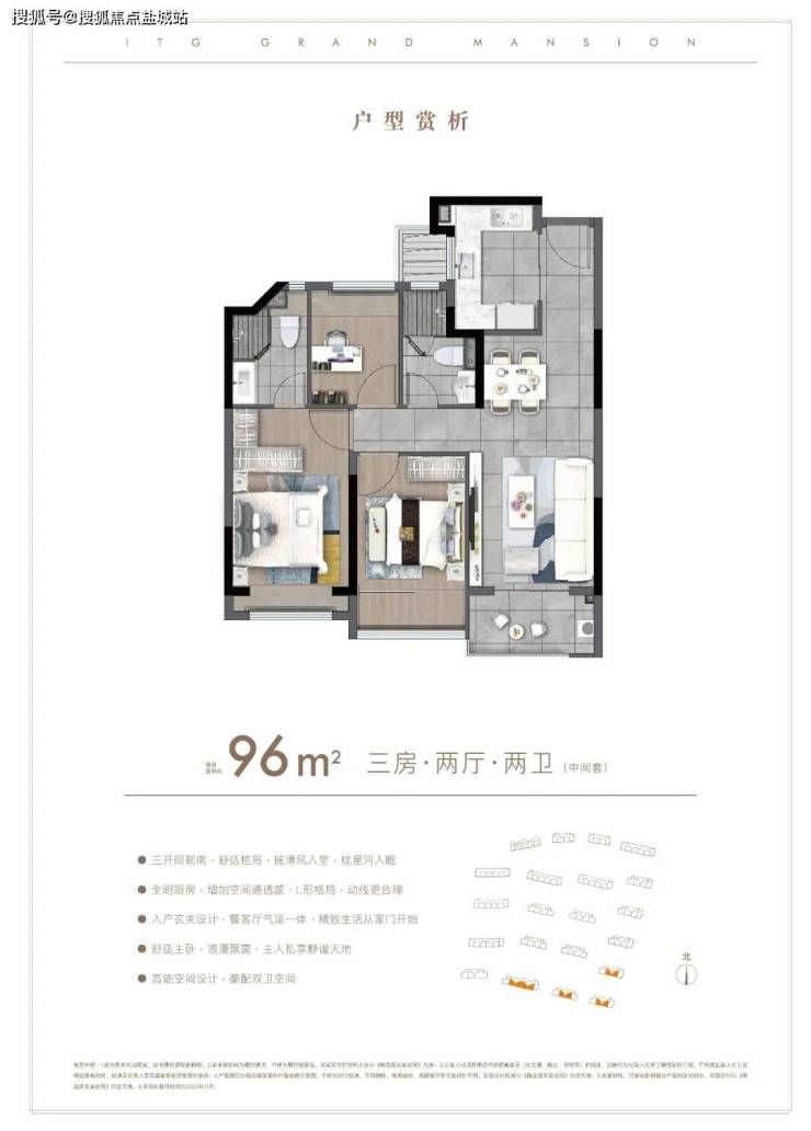 户型方面:约85-96㎡的全三房设计,每一款户型都是会传递出国贸的产品观。南北通透,布局考究,动静分离。