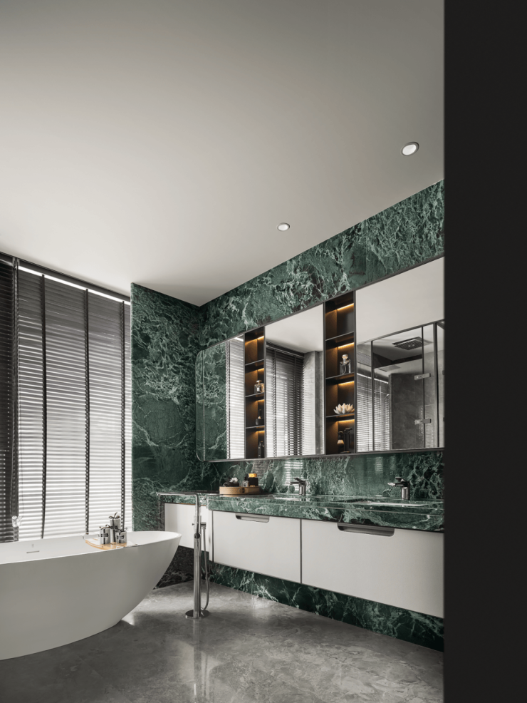 沿着木纹而生的大理石干泡台蜿蜒出灵动的曲线,流觞曲水的风雅被迎进室内。银壶盛满至洁的秉性,独立的衣帽间、化妆台,卸下铅尘繁杂,转头可见圆融如“不系舟”的浴缸,百叶窗保护隐私又不影响欣赏美景,让温热的芬芳包裹自己,享受全身心地放松,爱自己是要终身修习的浪漫。