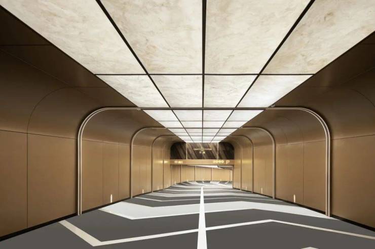 「未来客厅」以引领当下的办公空间趋势为设想,科技与美学的相互碰撞,演绎多维先锋审美的未来办公场域,塑造富有当代性与艺术性的体验空间。内部空间设计上,延续现代简洁的设计,采用大量钛空银、白色渐变玻璃和镜面材质,在深色石材的加持下,营造办公场所应有的严谨与格调。