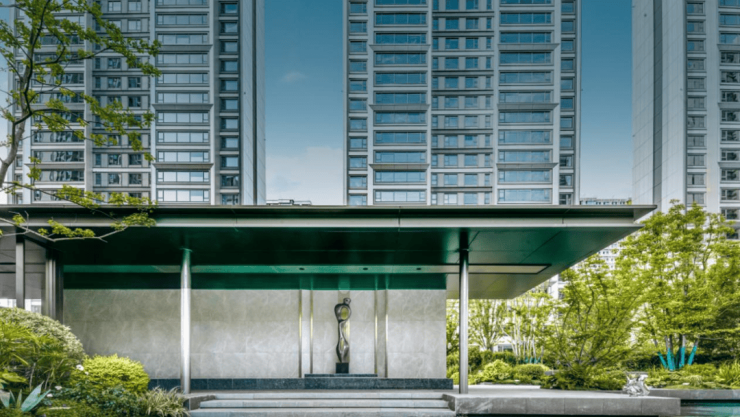 从立面、园林到室内,江心印园皆展现超预期质感。质感外立面在阳光下熠熠生辉,极具辨识度。铝板+石材+玻璃幕墙,辅以高窗墙比,呈现出一种独特的框镜设计风格,奢雅的灰调搭配大面积玻璃,辉映建筑灵动的艺术美感。