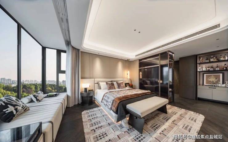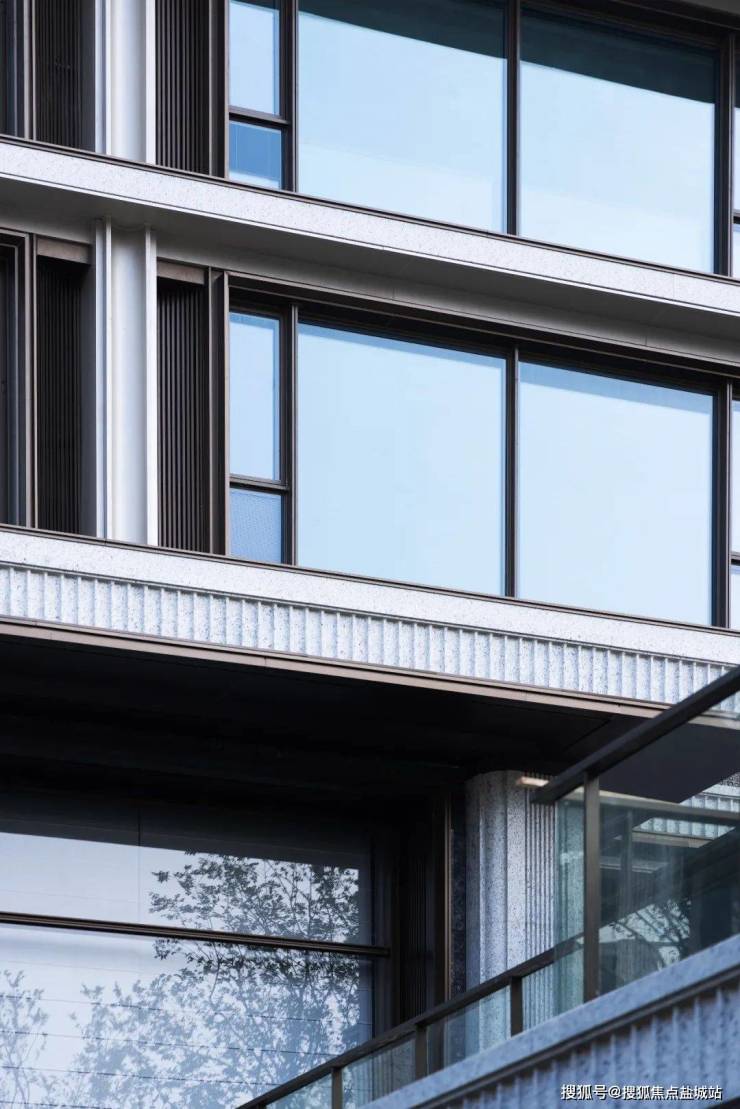 建筑立面设计汲取古典三段式构图精髓,通过横向水平线条的连续性与竖向柱列的支撑,形成建筑的基本韵律和节奏。顶部的开放式飘板设计赋予建筑轻盈的轮廓,单体建筑的比例在群体关系中得到进一步强化,建筑的进退与高度的轻微起伏,带来了群体关系上的灵动感受。面向城市的落地窗和转角飘窗消解了建筑的体量,将景观引入居住内部空间。