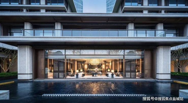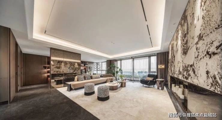 车马院以上海半岛酒店作为灵感来源,在设计方面采用了海鸥丽晶酒店同款的接待门,凸显出尊贵的大家门厅风范;营造社区归家的玄关,下挂式的星空顶、艺术雕塑、迎宾叠水以及范思哲黑背景墙相互映衬。