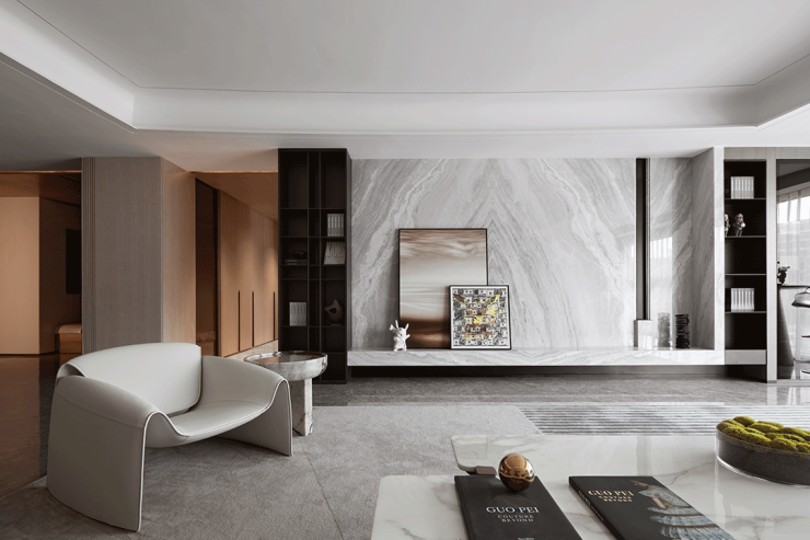 客厅在多重材质的组合下,顺畅融汇 秩序井然素雅的基调来自比例的精准把控和色彩的考究搭配,克制之间彰显出游刃有余的平衡之道!电视背景墙利用石材自身纹理,将水光潋滟的迷人景象引入室内,沙发后方的展示柜高低错落线条置于其上,玻璃和金属交融出迷濛光影!