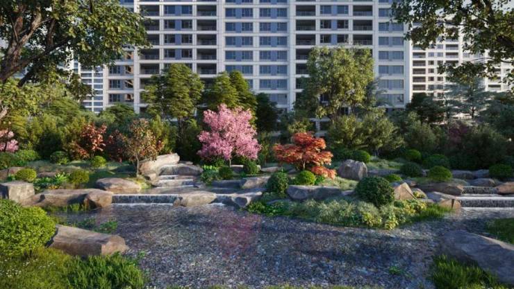 在景观打造方面,项目风格是新海派风格,特点是延续海派文化的典雅格调。整个社区采用 “一环”“两轴”“三园”“六院” 的空间结构,展现现代海派的精致人居空间。
