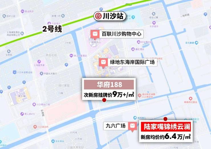 项目位于浦东的2号线川沙站旁约850米(数据来源,百度地图测绘),是个含金量很高的地铁盘。