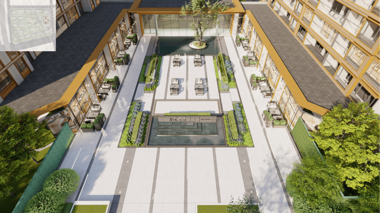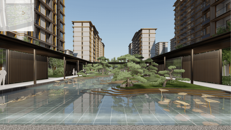 景观设计:以“莲”为主题,以光为载体,汲取“莲”清心,洁净的精神品质打造隐匿于闹市中的“一亩方塘”。以探寻”莲花“成长过程,营造四段归家情绪体验。打造“一轴,一廊,一环,四庭院”的格局空间。