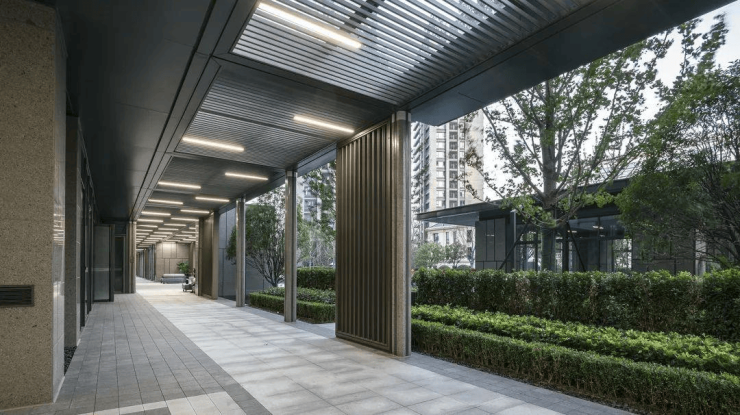 园区景观:义乌最长风雨连廊,百万级罗汉松打造