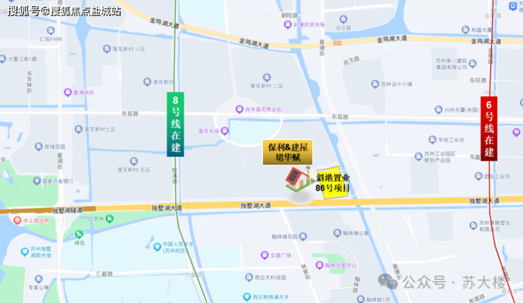 保利建屋珺华赋位于园区星塘街西、独墅湖大道北,交通上在地铁站6/8线均不远,独墅湖大道,中环东线就在附近,出行便捷。商业的话,联丰广场、翰林邻里中心、斜塘邻里中心都不远。同时项目靠近独墅湖科教区,独墅湖、大学城近在咫尺,环境优美,氛围浓厚。