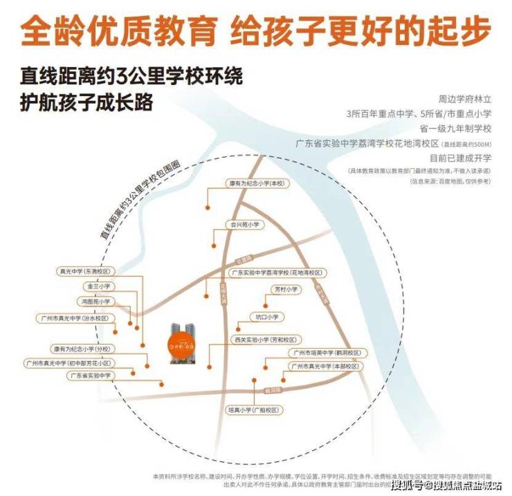 项目自身配建了一所9班幼儿园,距离花地湾省实学校直线距离500米,周边还有真光中学、康有为小学、培英中学等名校