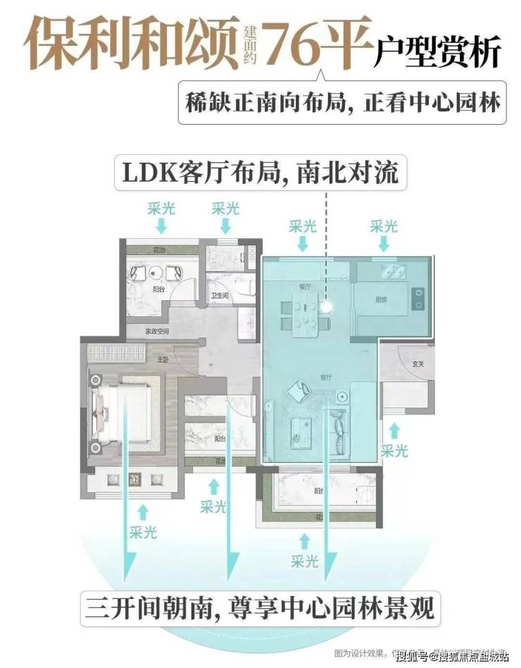 ▪南北对流 ,三开间朝南望中心花园,1+X客厅设计,客厅开间约3.8米