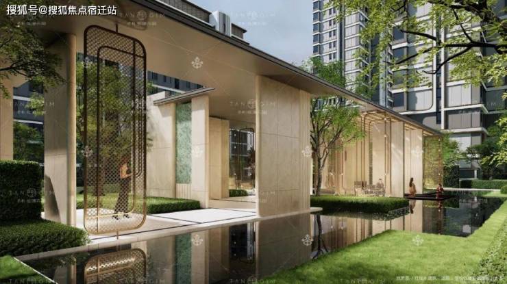 会所中间是一座下沉式“琉光水院”。通过高差与造景的处理方式,引水入园,会所好似被水与林带所包裹,室内外融为一体。