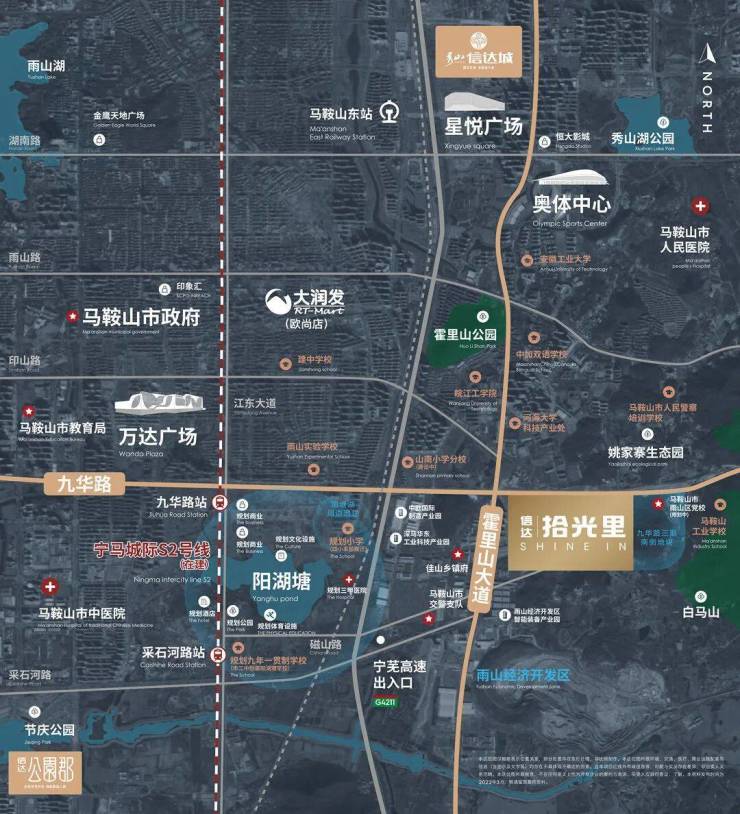项目位于雨山区九华东路与磁山路交叉口,九华路作为城市中心东西向的形象交通路网,贯穿马鞍山,轴线经过城市未来阳湖塘板块、宁马城际九华路站,出行方便。