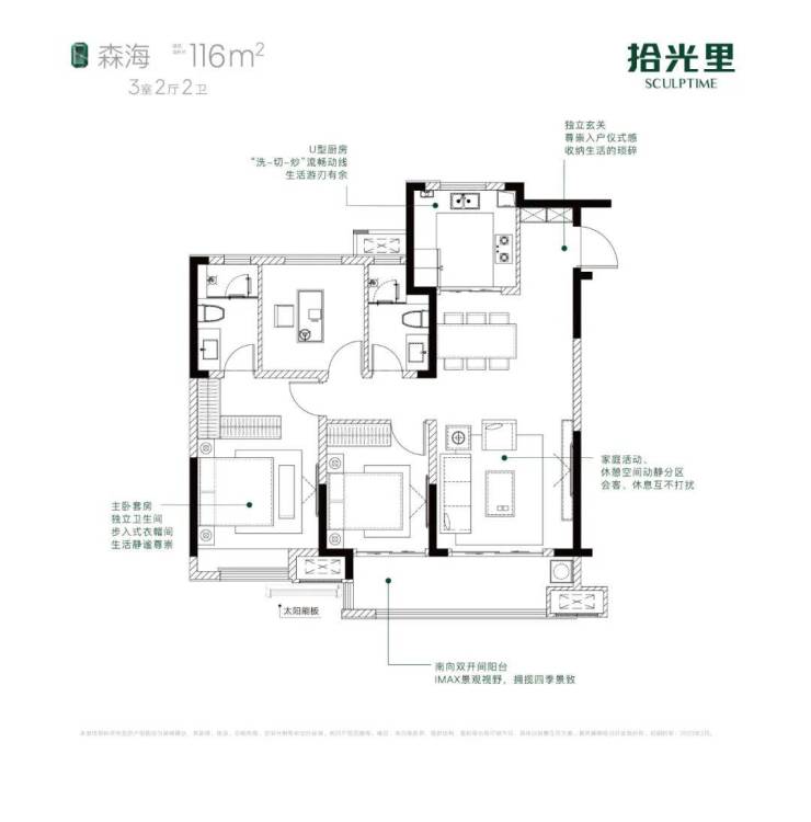 建筑面积约116㎡的三室两厅两卫,以大尺度、大开间、餐客厅一体等标准打造。三开间朝南,双开间阳台,主卧套房设计,尊享主人静谧尊崇;尺寸宽朗舒适,更显从容尺度。