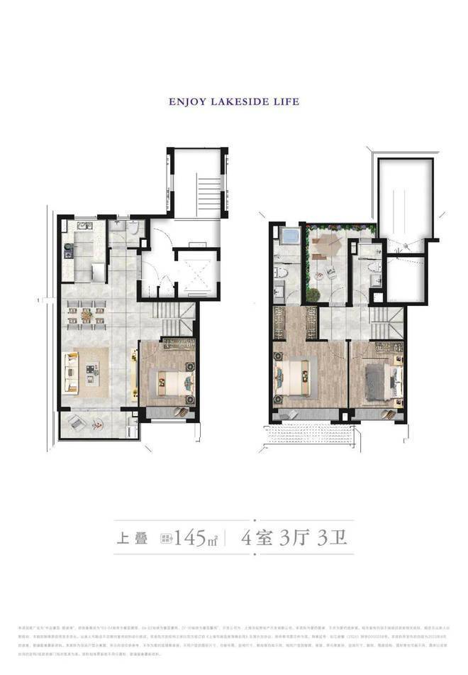 建面约145㎡-155㎡的4室2厅3卫叠墅产品。当然,4层高的叠加产品,楼上楼下的设置令人羡慕,动静分区,空间划分更符合人居生活理念。