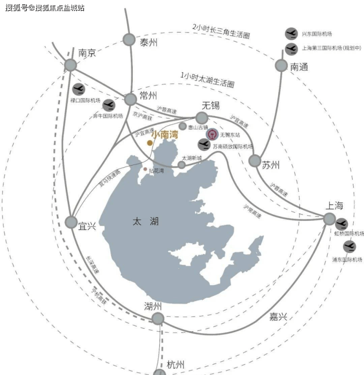 小南湾周边航空、高铁、高速等交通网络发达,紧邻环太湖公路、陆马公路等主干道, 直达沪宜高速、沪常高速;驱车40分钟左右可达无锡站。