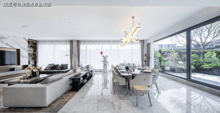项目平均南向面宽约 23 m,最大面宽达到了较为惊人的26m,很大程度保证了室内采光和视野;第二,南向玻璃最大约65%窗墙比,而目前市场上大部分豪宅窗墙比在50%左右,让室内场景的透光面积更大;
