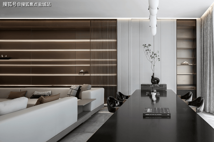 餐厅 厨房与楼梯间,设立了开放的中岛台,形成视觉隔断,在增添功能性的同时,也流露出设计师严谨的美学思考,以及对空间节奏的把控!沿梯下行楼梯利用灯光,呈现出轻盈的悬浮感,夹层作为阅读空间延续了整体色调,在黑白之中求得平衡 不张扬 也不喧闹,弧形沙发和圆形茶几带来的包围感!