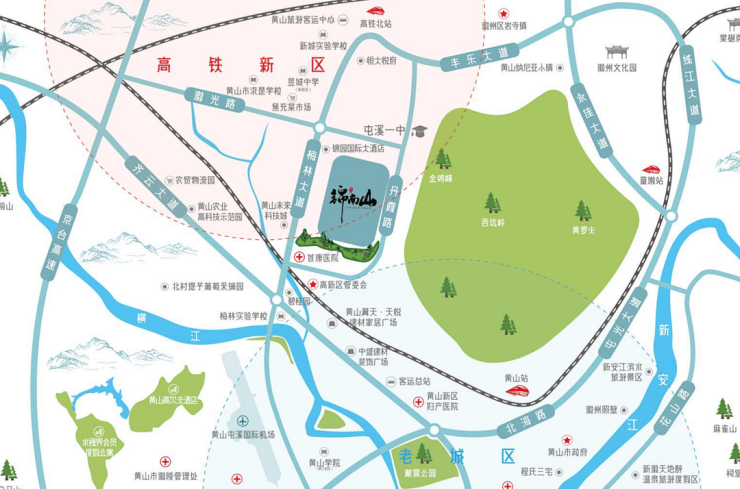 【黄山新城】坐落经济开发区最新规划核心片区,拥有“一心”、”三轴“、”四片区“的“三重规划优势,黄山高铁北站、屯溪一中、黄山现代实验学校、昱城学校、首康医院、中国移动数据中心、中国银联……教育、医疗、交通配套愈加完善,随着黄山高新区的崛起,黄山中心城区已经逐步从屯溪老城区往高新区偏移。