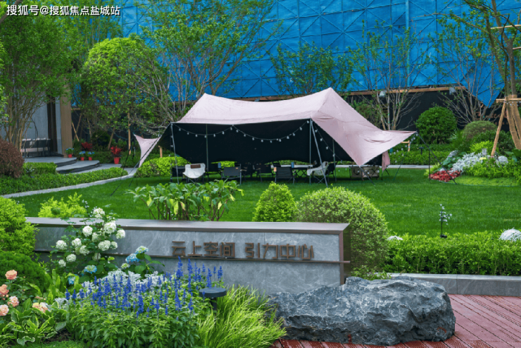 廊架下方,一处半围合的会客空间若隐若现,后期在这里或品茗、或插花、或对弈、或社交......一厅、一水、意境深远,整体的空间氛围大气且优雅。会客厅前方是近350㎡的中央阳光草坪的云上空间,为业主提供多功能户外活动场地,聚引生活的引力,绽放社区的活力。