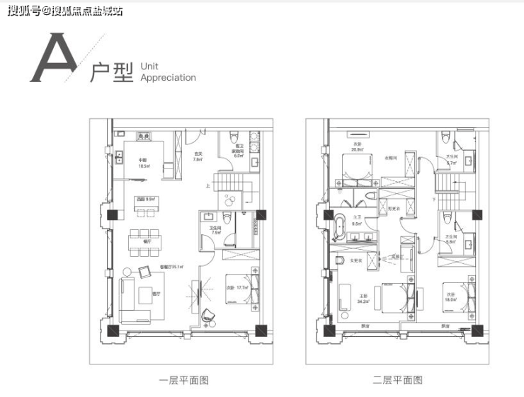 A户型:180度全景采光,超大尺度一体客餐厅,奢阔主卧。
