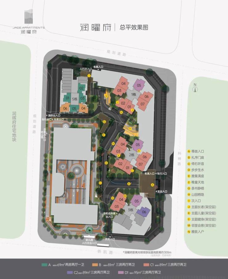 润曜府由4座建筑组成,其中1栋、2栋、3栋是47-48层高的纯商品住宅楼;4座是3层高的18班幼儿园教学楼;5栋29层高的普通商品住宅+自持保障租赁住宅楼。