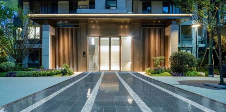 所有单元入户门采用仿铜不锈钢金属大门,门牌以金属立体字镶嵌于咖金色铝板之上。地面铺设采用拼纹工艺的高档地砖,将质朴的板面转化为家的温暖符号。这些细节在每日归家时刻唤醒居住者的尊崇感,让仪式感成为日常生活的一部分。