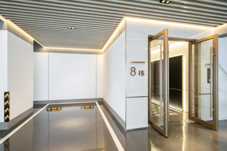 车库电梯厅采用金属与玻璃的复合结构,既保持了视觉的通透轻盈,又确保了使用的坚固耐久墙面与地面铺装经过精密计算的光影折射,创造出明亮通透的空间感受,让每一次经过都成为美学体验。