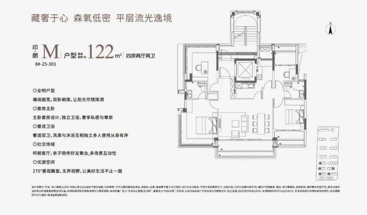 部分约122㎡中叠四房M户型,采用大平层级的宽尺社交横厅+超尺阳台+全卧飘窗设计,全屋采光条件极佳。