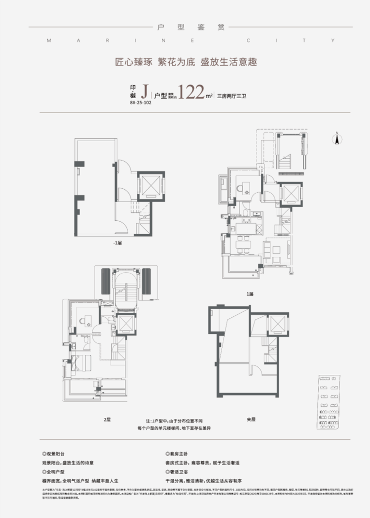 最后是的122㎡下叠三房J户型,上下多层满足多孩或三代家庭同住。