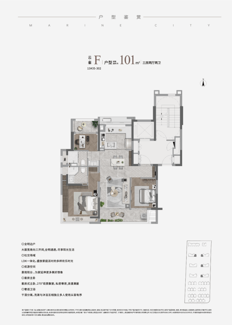 部分约100-101㎡H边厅户型,全景阳台搭配主卧L型转角大飘窗,三面采光+270°环幕视野,景观面堪比豪宅尺度。