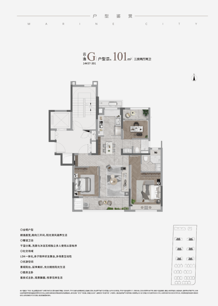 升级版的建面约101㎡高层三房F和G户型,是本次开盘的供应主力,在尺度感上更进一步,南向三开间宽幅采光,LDK一体化搭配双联大阳台,提高居住舒适度;三个卧室处于房子的三个方位,互不影响,家庭成员的私密性得到保障。