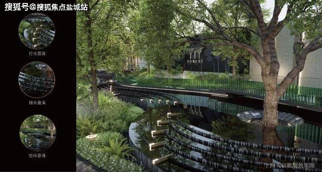 树与树编织而成一座座漂浮空中的立体浮亭,述说着自然生长的力量。艺术气泡装置蔓延而上浮于空中,在浮亭间荧光闪烁,伴随逐点星光,叠瀑从最高处潺潺流下。艺术化重绎植物、构筑、流水的关系,三位一体拥光抱影,宛若“水木鎏金”般的空中华庭。
