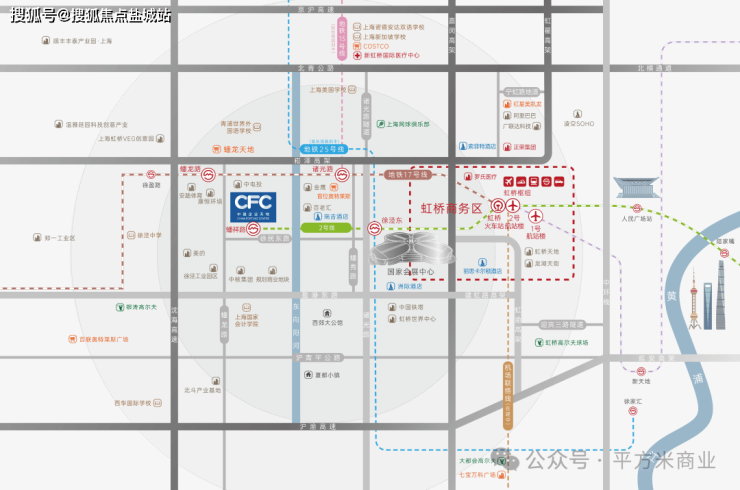 项目500米范围内的2号线蟠龙路站,日均进出站量4.2万人次,与虹桥枢纽形成“双流量引擎”。更为关键的是,3公里半径内已汇聚47家世界500强区域总部及242家市级总部机构,包括美的、晶科能源等产业龙头,形成年产值超580亿元的会展经济生态圈。