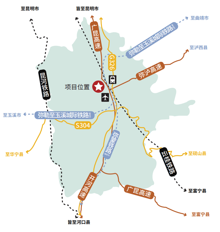 弥勒位于滇中城市群核心,北邻昆明,区位优越,交通便捷。从弥勒站出发,高铁34分钟即可直达昆明南站,通过昆明辐射成渝经济圈、广西、广州、贵州、湖南、湖北等城市,便捷通达全国。