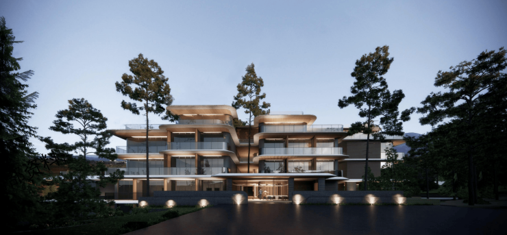 依循山谷间自然地形地貌,将广袤自然让渡于居住。以风格独特的点式布局,实现约0.1超低综合容积率。密林围合院落屋舍,采用新亚洲建筑风格设计,通透敞阔,与自然和谐共生。