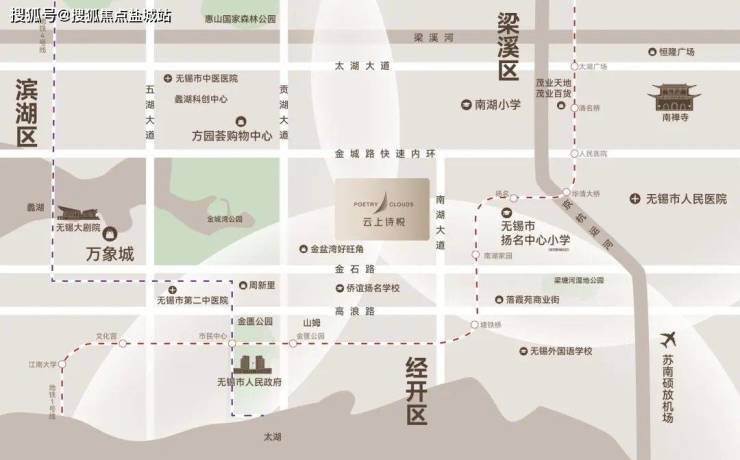 项目紧邻金石路、快速内环南、南湖大道三条城市轴线,可快速抵达无锡各个主城区,出行便捷从容;同时,三条城市轴线将自然生态、多元商业、人文休闲等资源串联,美好生活的想象由此展开。