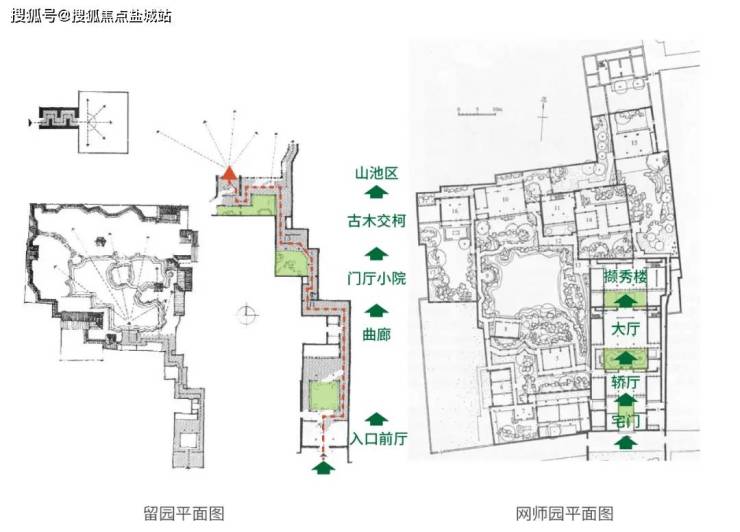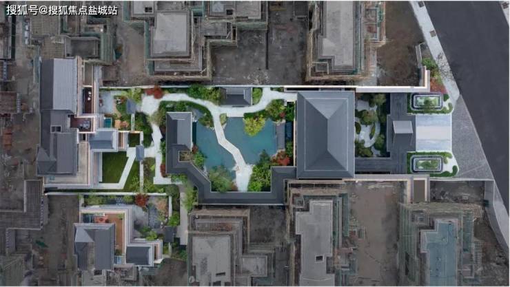 本项目以整体构园的思路着笔布局空间,进而叠山理水,梳理花木,营造屋舍,构园亦是绘画。高层与合院示范区两条轴线也是整个项目的庭院空间与视觉焦点。设计借鉴古典入园空间序列,打造多重院落、层层递进的归家礼序——留园入口欲扬先抑,进而忽收忽放、忽明忽暗,最终豁然开朗;而网师园由宅入园,由暗入明,围绕水池布置,渔隐于市。