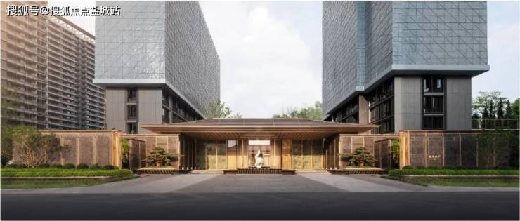 高层区主入口典雅中正,第一进门头采用更具现代感的大尺度坡屋顶,线条平直、横向舒展,悬浮于入口之上,大气磅礴。相较于合院区入口庭院的含蓄,高层区入口庭院显得更为直白、利落,将人们的视线引向檐下灰空间的水景、雕塑以及别致的团扇形移门。屋顶开启一扇天窗,将天光引入,形成云水为伴、青松揖礼的唯美图景。