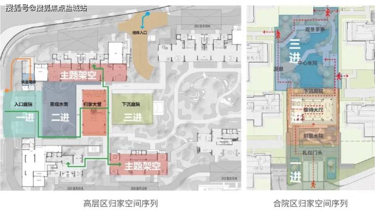 合院区与高层区归家空间均采用庭院式三进布局。高层区归家空间沿东西向展开,一进为入口庭院,二进为归家水院与归家大堂(生活馆),三进为下沉庭院,衔接归家大堂(生活馆)地下一层与高层区地下大堂入口,形成立体的沉浸式入户体验。