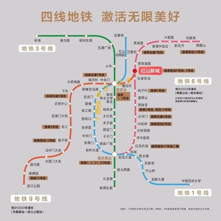 超级交通:6号线、9号线地铁上盖,红山新城站,预计2024年通车,2公里内还有1、3、7三条地铁线。地块1公里范围内有9条公交路线。红山路、恒嘉路、北苑东路、经五路、大壮观路、领智路、红山南路形成四纵三横格局,通过新庄枢纽直连南京井字内环,快速通达全城。