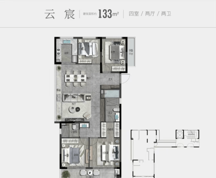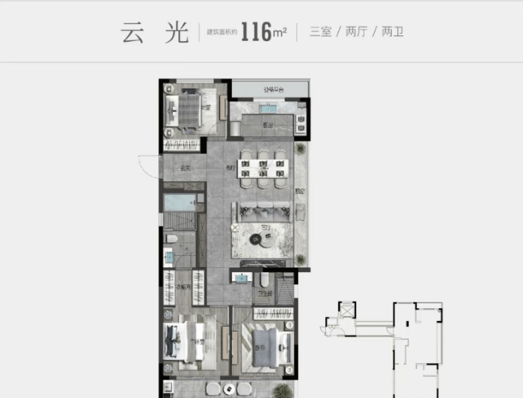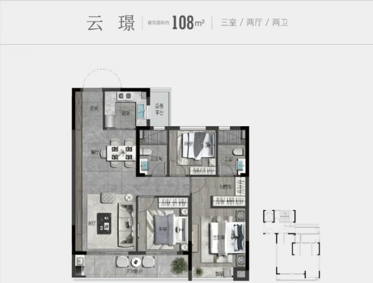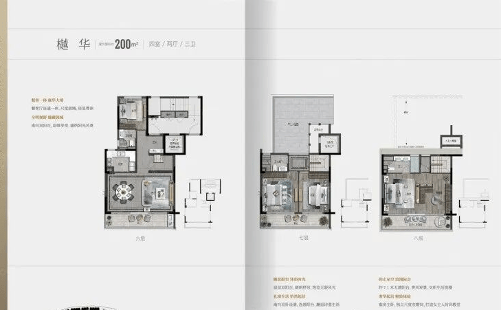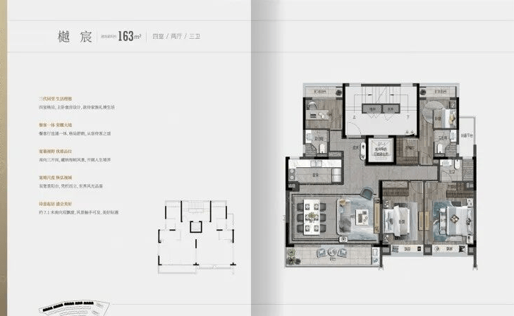 户型设计:主力户型为108-200㎡,如建面约163㎡的叠墅大平层,采用一梯一户、双套房设计,配备大面积阳台和飘窗;高层户型约108㎡,三房两厅两卫,南向双联大阳台,采光与视野俱佳。